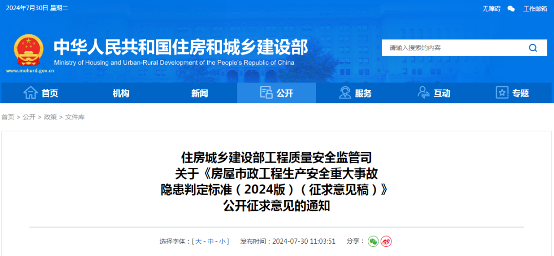 住房城乡建设部工程质量安全监管司关于《房屋市政工程生产安全重大事故隐患判定标准(2024版)(征求意见稿)》公开征求意见的通知