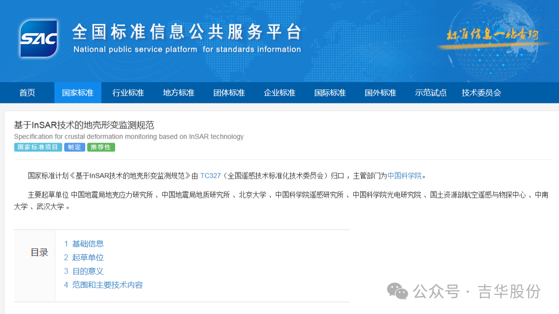 国家标准《基于InSAR技术的地壳形变监测规范》发布,为吉华的遥感监测提供标准依据