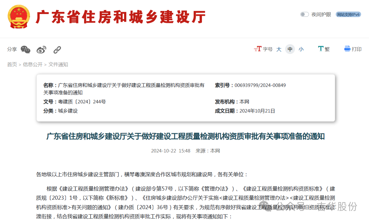 广东住建厅发文通知,我省建设工程质量检测机构资质统一延期至2025年10月31日