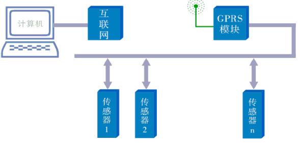 将多个传感器通过一条总线连接起来,通过GPRS模式、无线网络等方式将数据传输至监测控制室电脑之中。